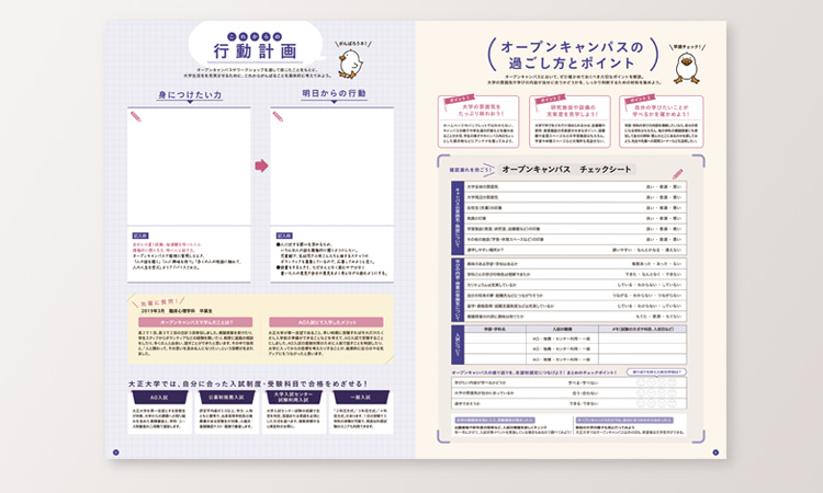 興味関心から学部・学科を探したり、実際のキャンパスを見て感じたことや、学びの内容、先生や在学生の印象などを書きとめておくことができる活用ノート。進路を考えるのに役立てられます。
